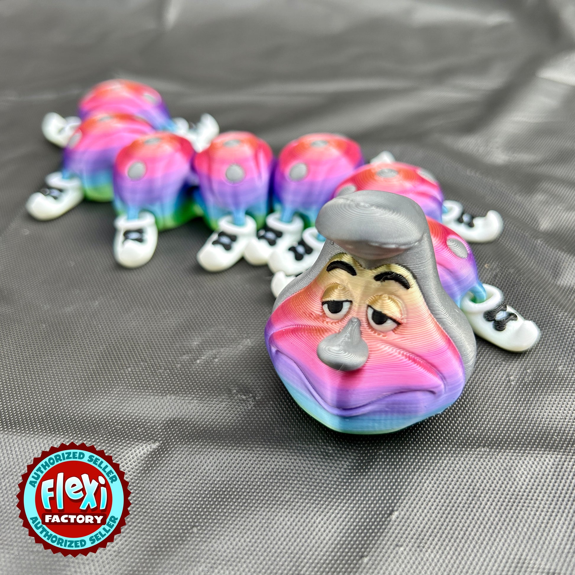 Cartoony Aesthetics: Flexi Factory's distinctive design aesthetic shines through in every detail. With its whimsical expression, oversized eyes, and delightful proportions, this caterpillar exudes a joyful and lighthearted vibe that's sure to brighten up your day.