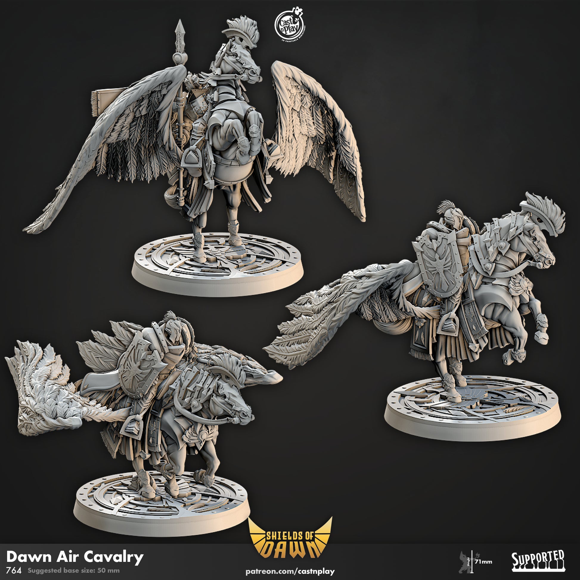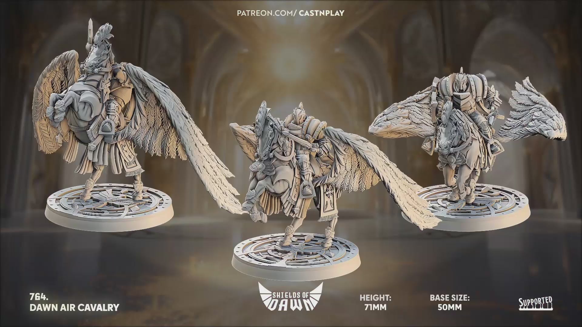 The Dawn Air Cavalry are perfect miniatures to represent mounted holy knights for Dungeons and Dragons, Pathfinder, Daggerheart and other tabletop roleplaying games. Also a great asset for any army for Tabletop Wargaming.