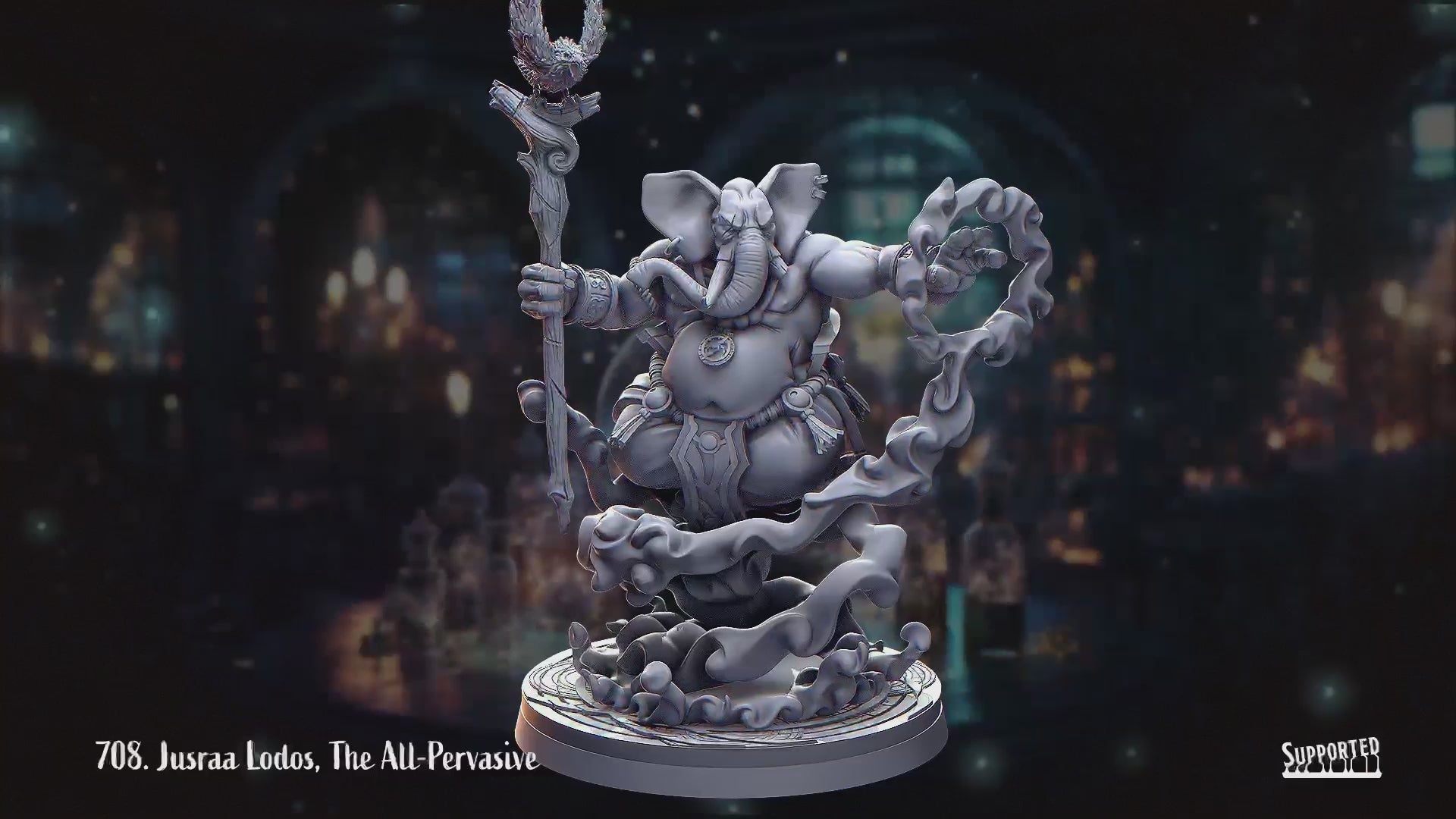 Jusraa Lodos is a large Elephant Humanoid caster, perfect to represent a Loxodon character in any Dungeons and Dragons, Pathfinder and other tabletop roleplaying games.