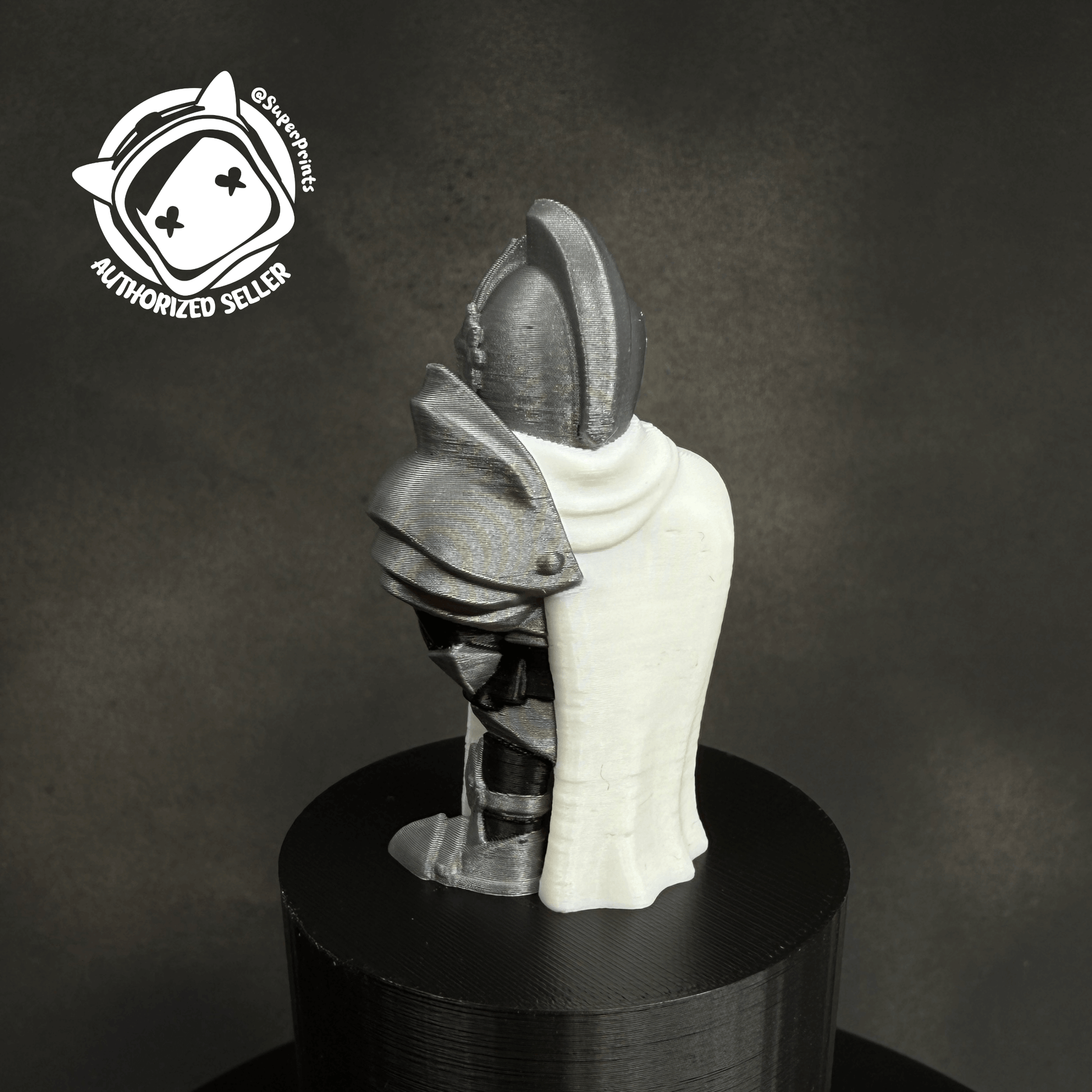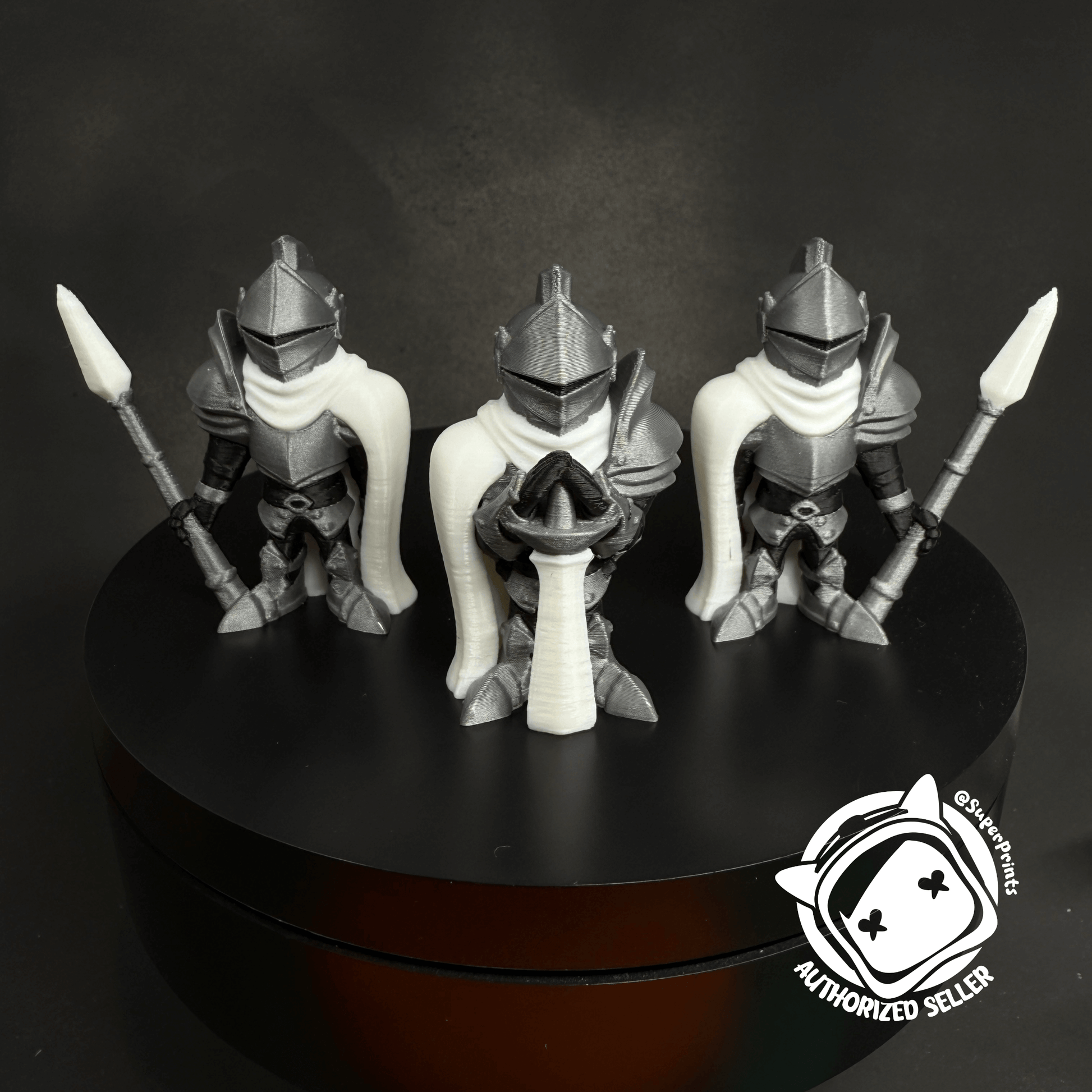 - The Sword Knight – standing firm, hands resting on a massive blade, glaring through the slit in his helmet.